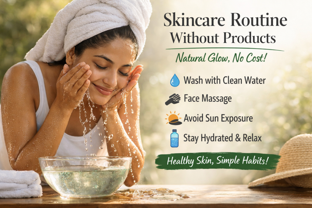 A skincare routine without products works best when followed with patience and consistency. By focusing on simple habits, hydration, relaxation, and quality sleep, you can achieve healthy, calm, and naturally glowing skin—without creams, serums, or money. Real skincare starts with how you treat your skin every day.